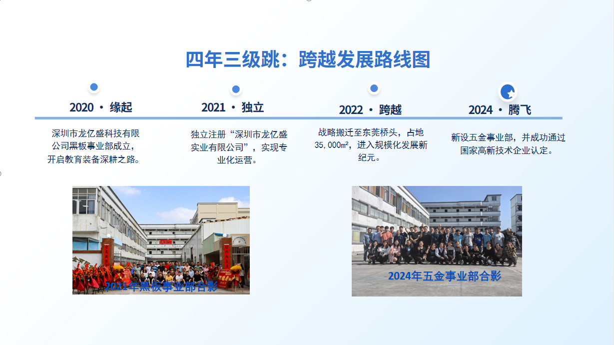 东莞市龙亿盛橡塑五金有限公司,注册资金500万元,位于东莞市桥头镇石水口银河二路1、7、9号,是一家专注于五金冲压、精密钣金结构件加工与智能教育装备核心部件研发、生产与销售的高新技术企业。公司肇始于2020年,历经数次战略升级与产能扩张,现已成为拥有现代化生产基地35000平方米、专员团队200+人的行业领先者。我们秉承“勇于担当、说到做到、追求卓越、合作共赢”的核心价值观,致力于为客户提供从产品设计、精密制造到整机组装的一站式解决方案。